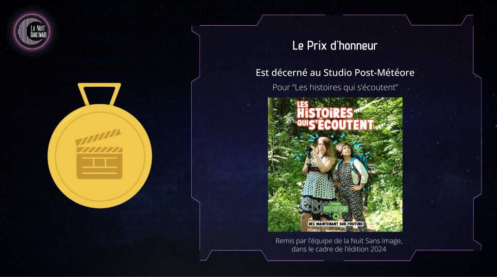 Le film a eu l’immense plaisir d’avoir remporté le prix d’honneur durant l’édition 2024 de la Nuit Sans Images.
